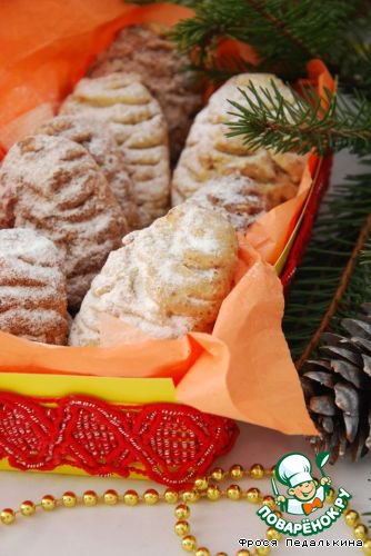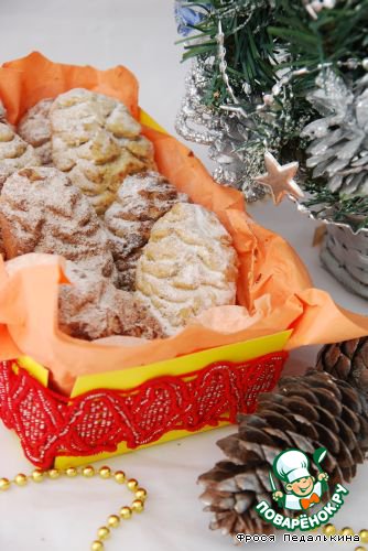 Смешать поровну какао и сахарную пудру, посыпать этой смесью еще горячее печенье. Когда шишки остынуть, слегка припорошить их сахарной пудрой.