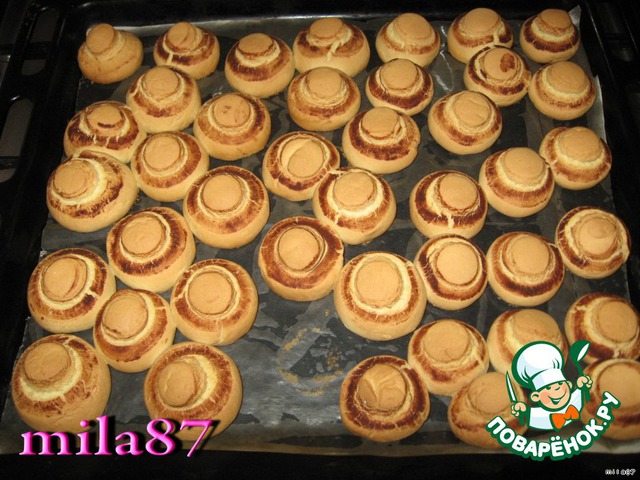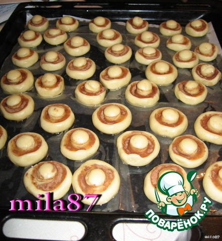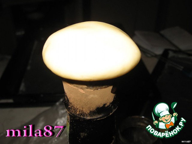 Накладываем на горлышко шарик из теста, прижимаем пальцами . Аккуратно снимаем, чтоб не деформировать идеальный "грибочек-шампиньончик". И так с каждым, не забывая окунать горлышко в какао перед каждым грибочком.