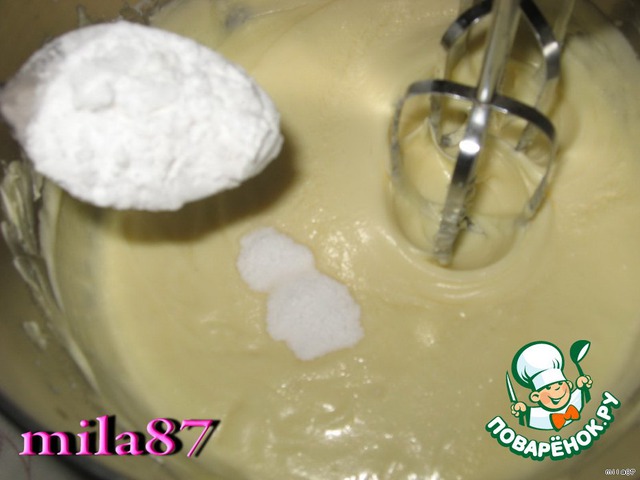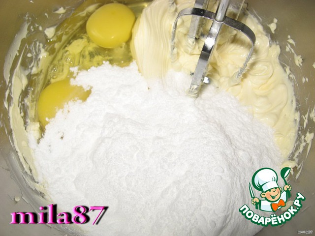 Размягченное масло, яйца и сахарную пудру тщательно перемешиваем миксером на низкой скорости до однородности.