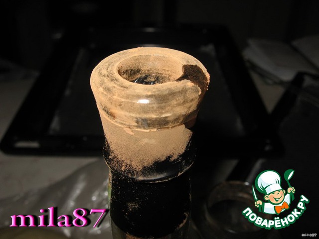 Берем стеклянную бутылку. Горлышко обмакиваем в какао.