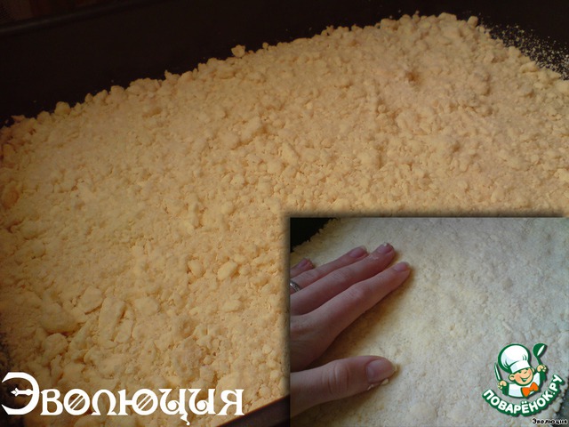 Форму смазываем маслом. Высыпаем в нее всю нашу масляно-сахарно-мучную крошку. И хорошенько приминаем рукой, так сказать, утрамбовываем.