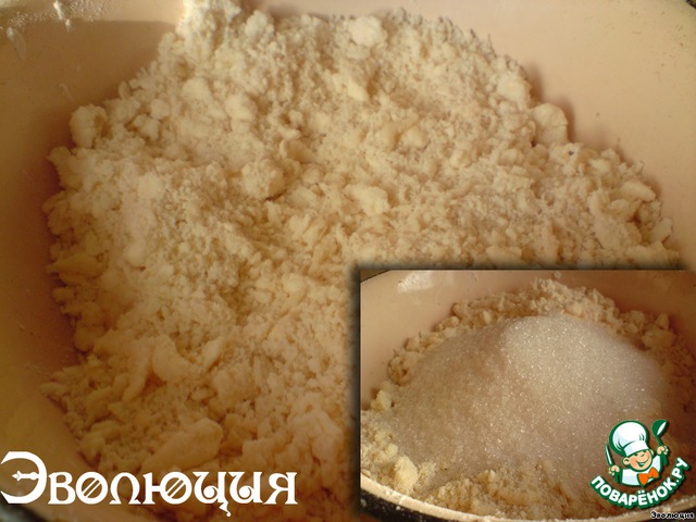 Масло (немного оттаявшее после холодильника) и просеянную муку перетираем в мелкую-мелкую крошку. Вместо масла можно взять маргарин, только хорошего качества!
