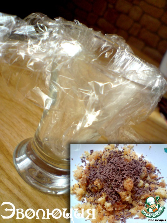 Далее понадобится рюмочка, похожая на колокольчик. Выстилаем ее пищевой пленкой. И начинаем понемногу всыпать крошку, хорошенько утрамбовывая пальчиком. Наполняем рюмку под «завязку». Ставим ее в остывающую духовку. У меня было около 50*С. Нам нужно только, чтобы шоколад растаял. И затем – сразу в холодильник. Собственно, чтобы шоколад «схватился».