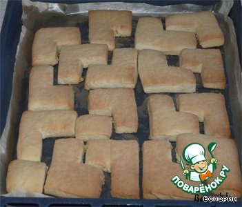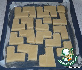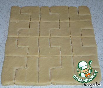 Раскатать тесто в пласт толщиной 1,5 см., расчертить ровненько фигурки пазлов, и аккуратно вырезать ножом.