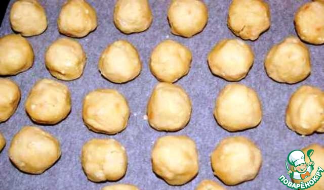 Все полученные части теста разделить на 30 одинаковых кусочков и скатать шарики 3-4 см. в диаметре, выстелить курабьедес на противень застеленный пекарской бумагой на расстоянии друг от друга. Выпекать в прогретой духовке при 180"15-20 минут.
