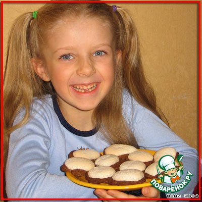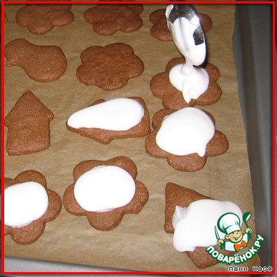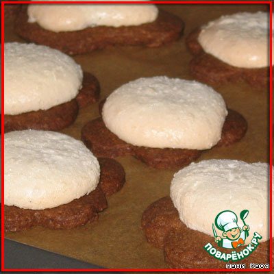 Наши печеньки испеклись. в духовке убираем огонь на 150 градусов, выкладываем на каждую печенину белковую массу (без фанатизма, оно еще увеличится в объеме).