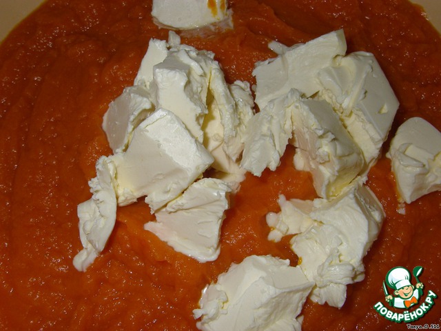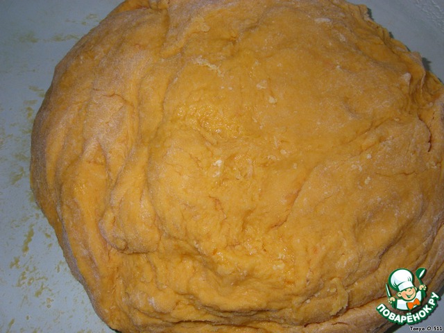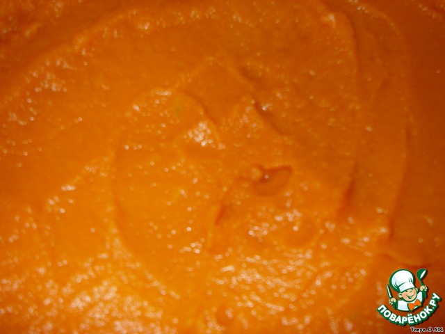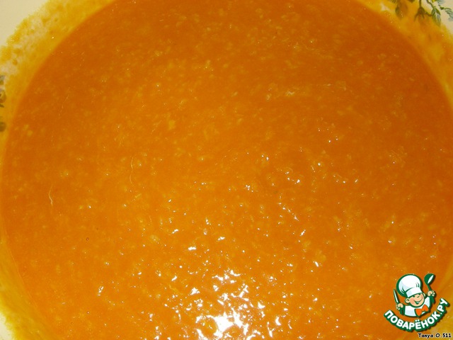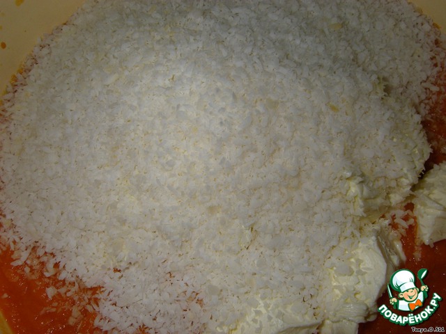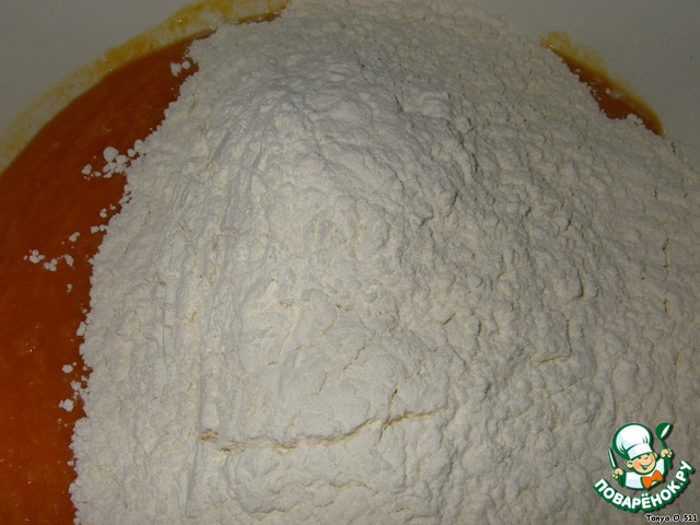 Далее муку просеять, смешать с разрыхлителем и добавить к оранжевой массе.
