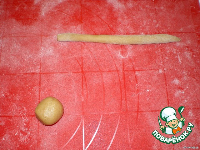 Скатать из белого и коричневого теста шарики диаметром примерно 3 см. Раскатать их в тонкие колбаски длиной до 15 см.