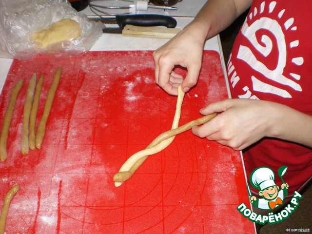 Выложить косички на противень, поставить в духовку и выпекать не более 15 минут.