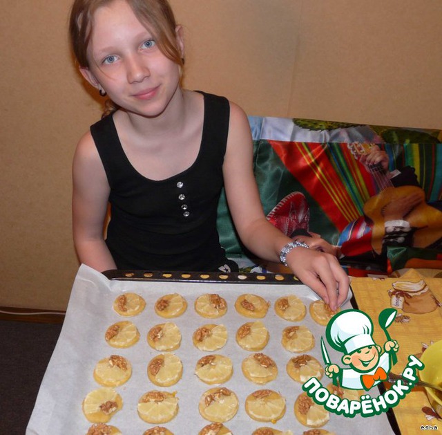 Наши печенья украсить кусочками лимона и орехами. Лимоны очень нужны - чтобы смягчить сладость меда, смазать яично-сметанной глазурью.
