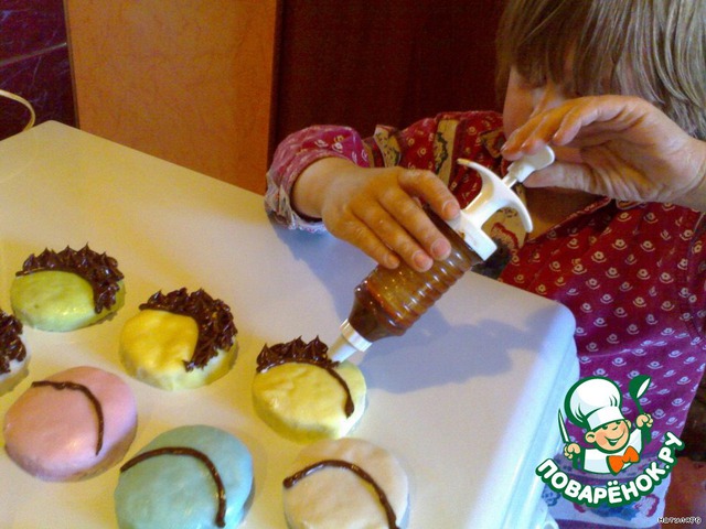 Покрывает мастикой печенье и обрезает лишнее. Он очень старался!