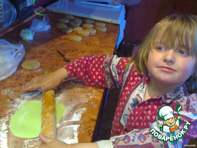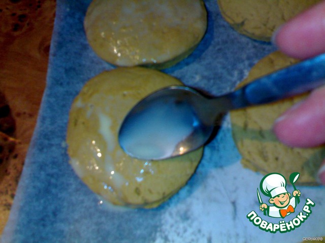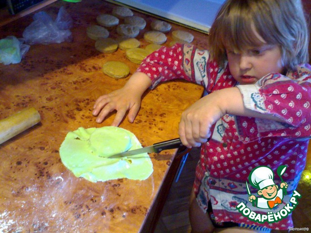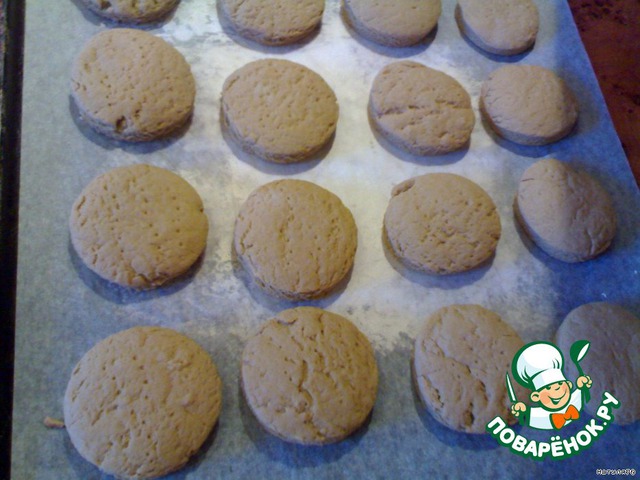 Тесто раскатываем в пласт толщиной 1 см. Вырезаем кружочки, складываем на противень - и в духовку. Выпекаем 25 минут при температуре 200 градусов