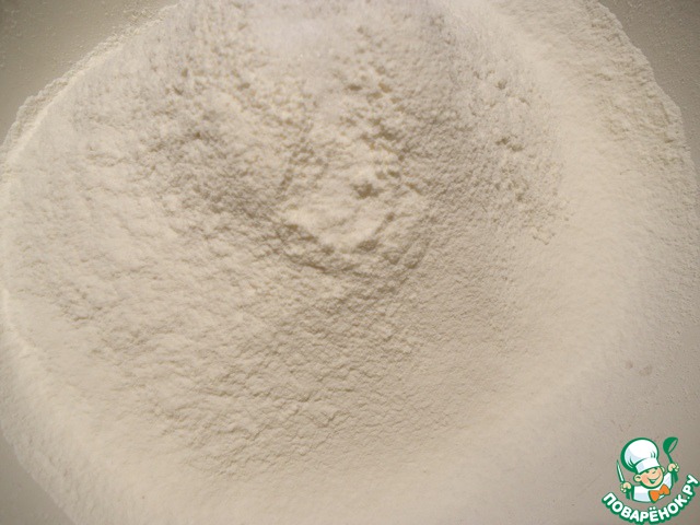 Муку просеять с разрыхлителем, добавить соль.