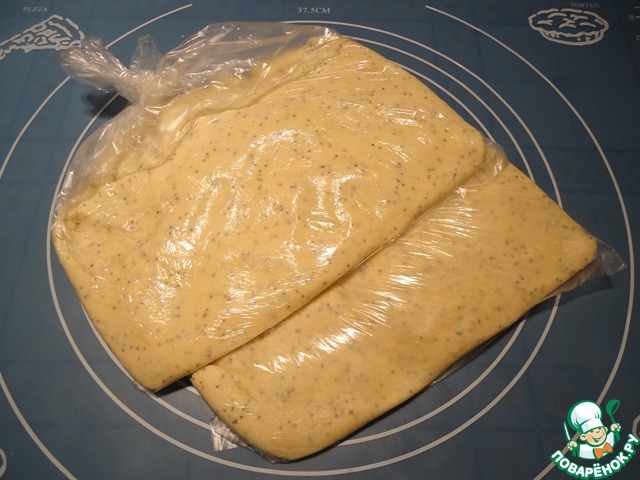 Добавляем муку с разрыхлителем и солью, быстро замешиваем тесто. Делим тесто на две части, помещаем в пакеты, немного распределяем тесто руками, чтобы получился слой толщиной около 1-1,5 сантиметров. Убираем тесто в холодильник примерно на 2 часа.