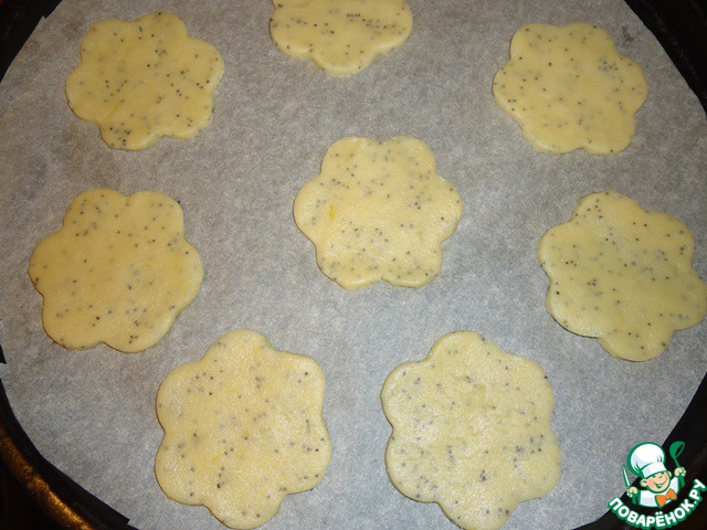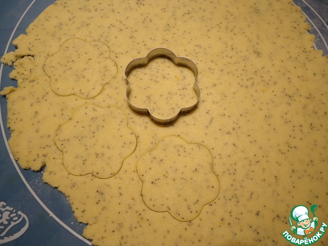 Охлажденное тесто раскатываем толщиной около 3-х мм, поверхность стола немного посыпаем мукой. Вырезаем печенье с помощью вырубки (у меня цветок) или стакана.