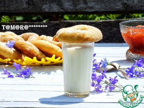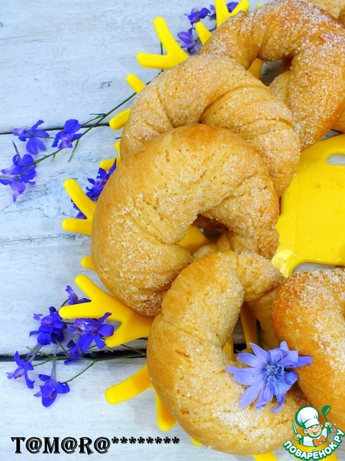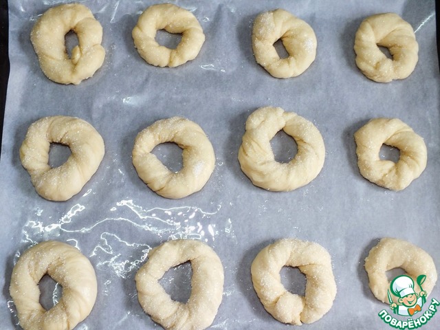 Тесто разделить на кусочки (у меня 19 шт). Сформировать колечки. Каждое колечко обмакнуть в сахар. Колечки выложить на смазанный противень и выпекать в горячей духовке 20-25 мин. при t-200* до легкого румянца.