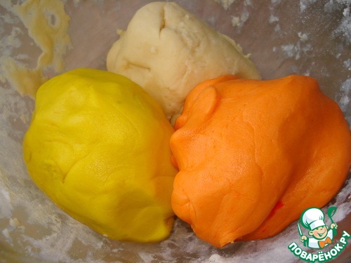 Одну часть теста покрасить в желтый цвет пищевым красителем, вторую в оранжевый (или красный) цвет, третью оставить без изменения.