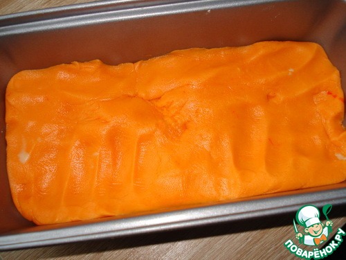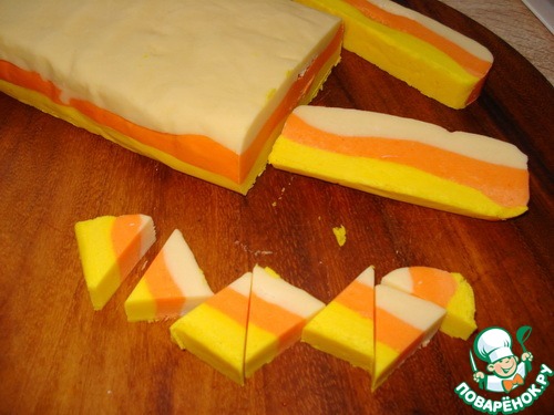 Сначала желтое тесто, потом, оранжевое и белое. Слегка нажмите на тесто сверху, чтобы слои склеились. Заверните брусочек теста в пергамент или полиэтилен и поместите в холодильник минимум на 4 часа и максимум на ночь.
