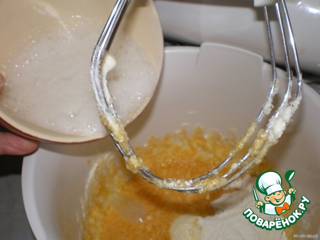 В отдельной посуде взбиваем белки в стойкую пену и вводим по чуть-чуть вместе с мукой к масляной массе.