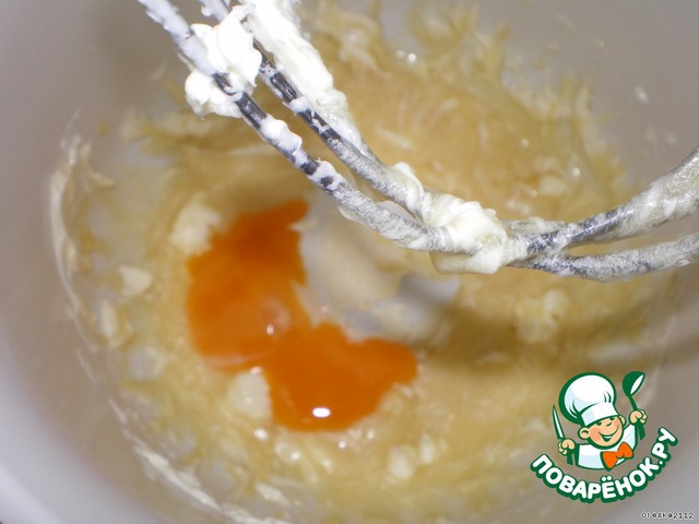 По одному вводим к маслу яичные желтки,каждый раз тщательно взбивая.
