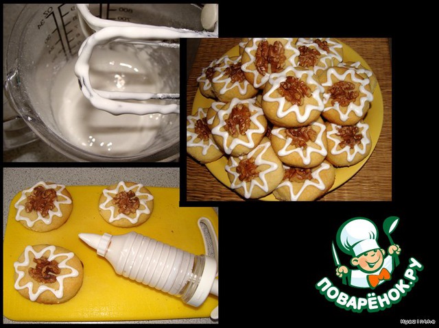 Пока печенье остывает, взбить белок, постепенно добавляя сахарную пудру, до однородной гладкой массы.