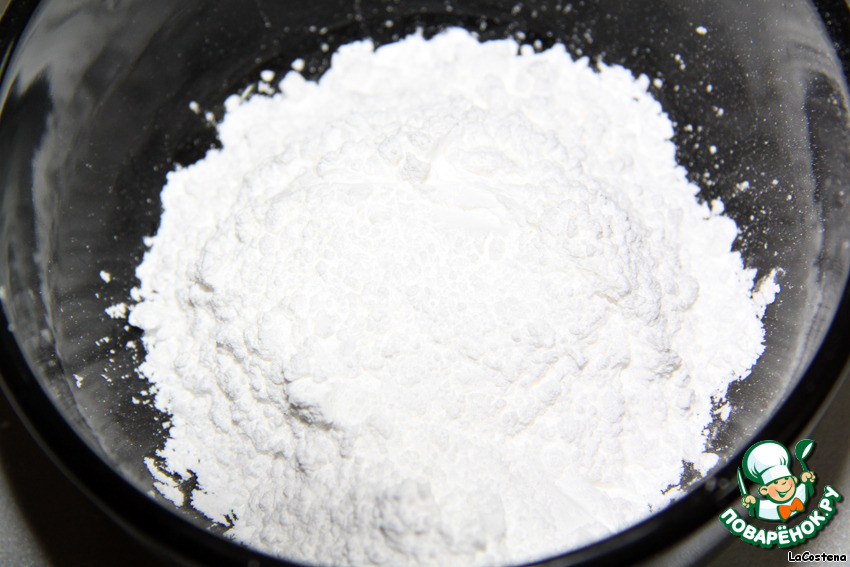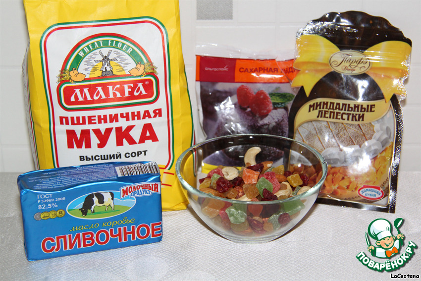 Наши продукты: мука, сахарная пудра, сливочное масло, смесь цукатов с вишней и миндальные лепестки.