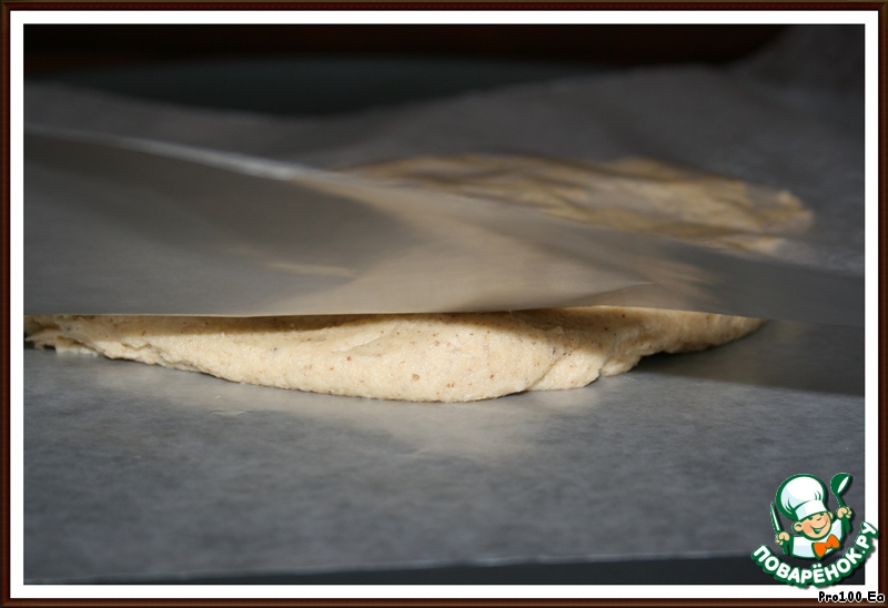 5. Положите тесто между 2 листами пекарской бумаги и скалкой раскатайте до диаметра 15 см. Отправьте в холодильник на 20 минут.