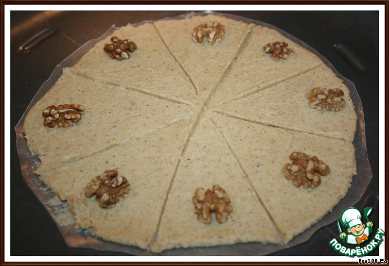 6. Ножиком разделить на 8 треугольников и украсить половинками орехов.