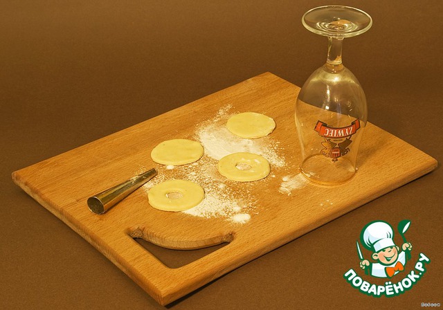 Утром раскатать на подпыленном мукой столе тесто высотой не больше 0,5 см. Стаканом или рюмкой вырезать кружки, в середине которых выдавливаем отверстие. Я использовала металлическую трубочку для выпечки пирожных "Слоеная трубочка с кремом".