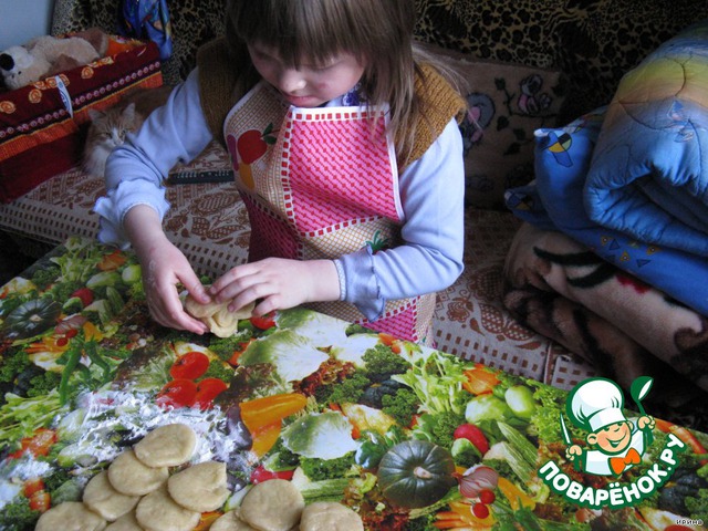 Тесто разделить на 2 части. Раскатать средней толщины, вырезать стаканом кружочки. И сложить их друг за другом.