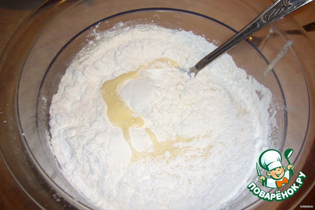 Смешиваем взбитые яйца, масло с сахаром, добавляем сметану, гашеную соду и коньяк. Добавляем муку и замешиваем тесто.