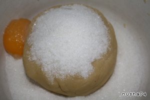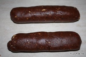 Добавить к тесту ванильный сахар,сахарный песок, желток, орехи с шоколадом.Тесто вымесить и положить в холодильник на 1 час.