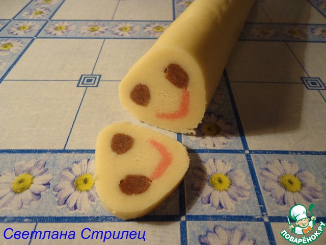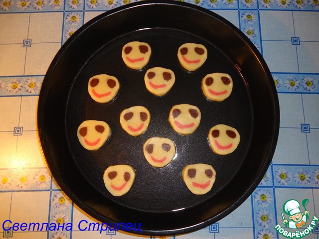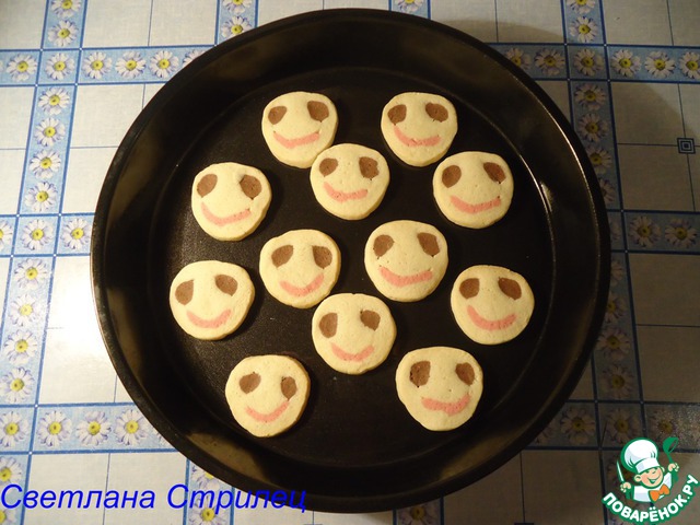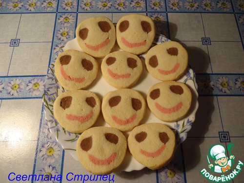 | Делюсь с Вами еще одним рецептом от Mabel Mendez. Огромное спасибо ей за очень интересные рецепты! Печенье получается вкусным, песочным. Самый главный плюс для меня в этом рецепте - это то, что мои дети могут принять самое активное участие при приготовлении этого печенья. Конечно, было бы проще из цветного теста прилепить сверху на печенье глазки и ротик, но как интересно готовить такое печенье именно по этой технологии. |