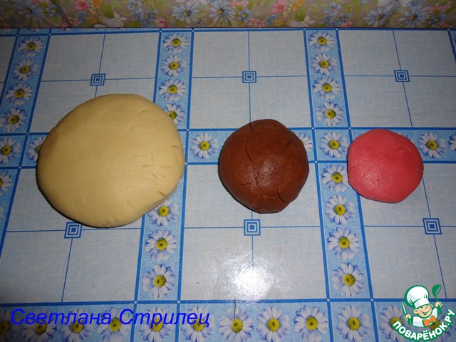Разделить тесто на три части: белый цвет - большая часть теста без добавок;