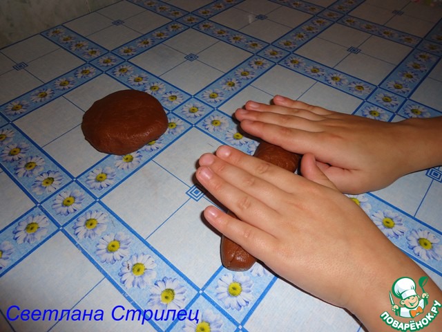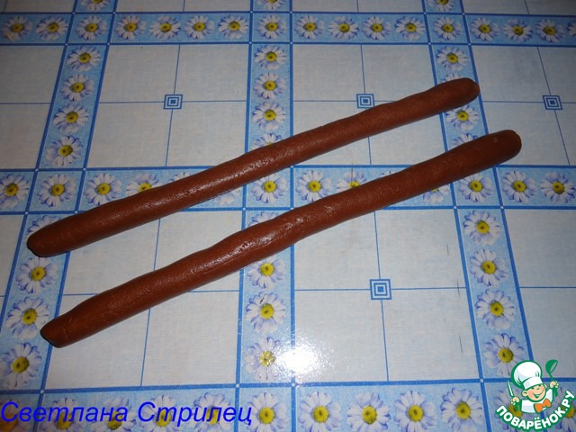 Из коричневого теста формируем 2 жгутика. Этим занялся мой сынок.