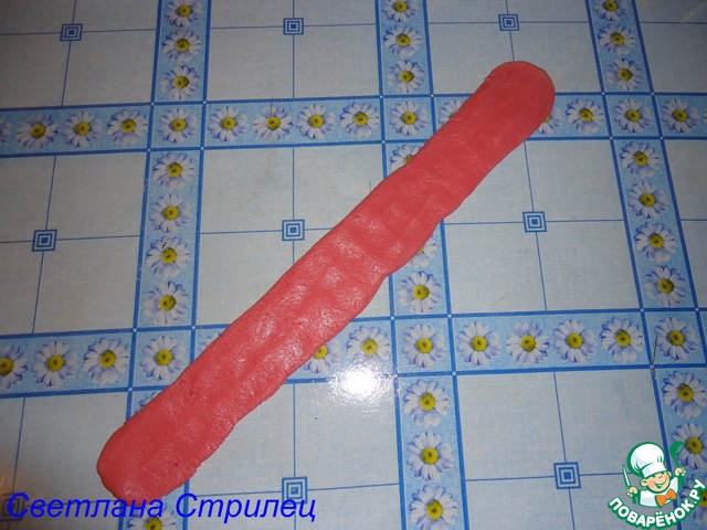 Из розового теста формируем тоже жгутик и чуть раскатываем его.