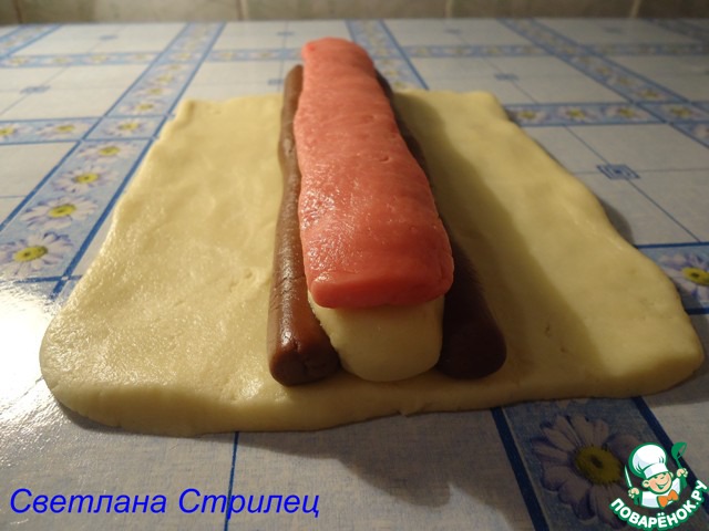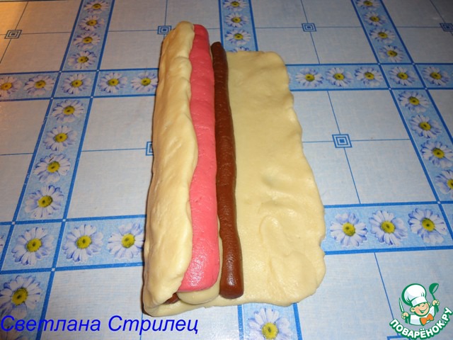 как бы чуть под него укладываем по сторонам коричневые жгутики. Сверху на белый жгутик укладываем розовое тесто.