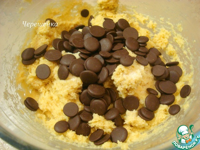 Кладем в тесто шоколадные капли. Если у вас их нет, то просто возьмите темный шоколад и порубите его крупными кусочками. Посолите.
