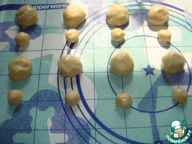 Тесто должно хорошо скручиваться в шар. Скатать большие шары и по количеству больших скатать маленькие.