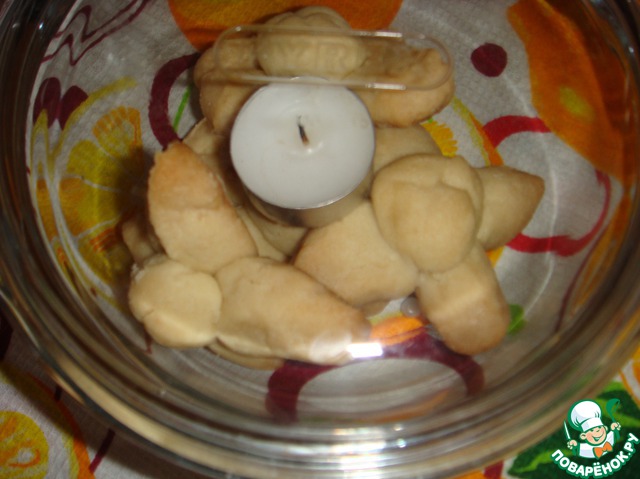 Затушить свечу и быстро поставить её в кастрюльку с печеньем, закрыв плотно крышкой. Дым от свечи придаст аромат ванили (или любой другой аромат по Вашему вкусу) печенью. Процесс можно повторить несколько раз.