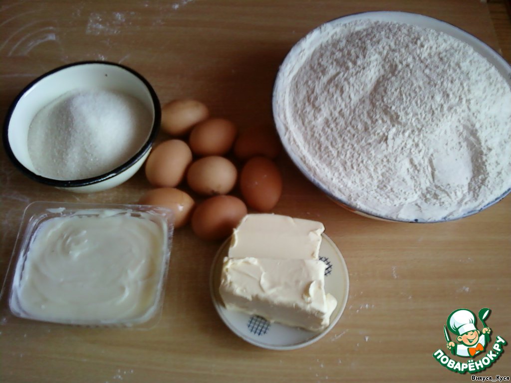 Нарежем в муку масло, смалец и посечём (предпочтение даётся натуральному маслу, но можно и спрэд), добавляем сахар, яйца и гасим соду. =-O
