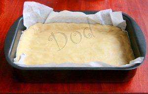 Застелить бумагой для выпечки форма (у меня размером 20х30 см), выложить сверху тесто, разровнять (края слегка приподнять).