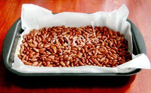 Застелить тесто бумагой для выпечки, сверху насыпать фасоль/горох, чтобы не деформировался корж и для равномерного пропекания. Поставить в предварительно нагретую до 180 градусов духовку. Выпекать 20 мин.