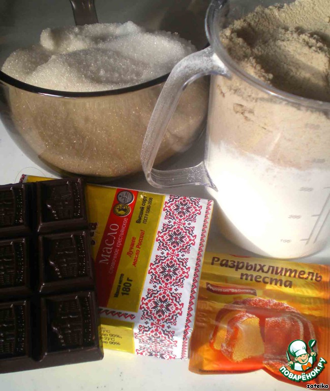 Нам понадобятся эти нехитрые ингредиенты. Шоколада можно взять больше, например целую плитку, это тот случай, когда шоколада много не бывает. В принципе, сорт шоколада каждый может выбрать по своему вкусу, однако мое мнение – в это печенье идеально вписывается темный шоколад с большим процентом какао (у меня «Бабаевский 75%»). Мука гречневая значительно тяжелее пшеничной, поэтому если ориентироваться на вес, то и той и другой нам понадобится 150 граммов, однако если мерить объем, то пшеничной понадобится примерно 300 мл, а гречневой муки – около 200 мл.