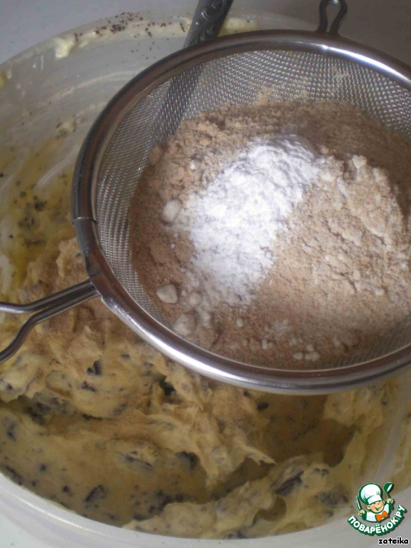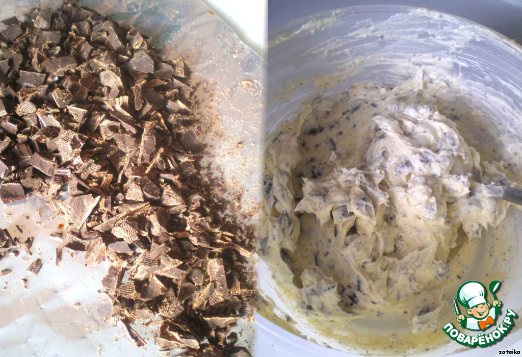 Шоколад рубим на средние кусочки, вмешиваем в масляно-сахарную смесь.