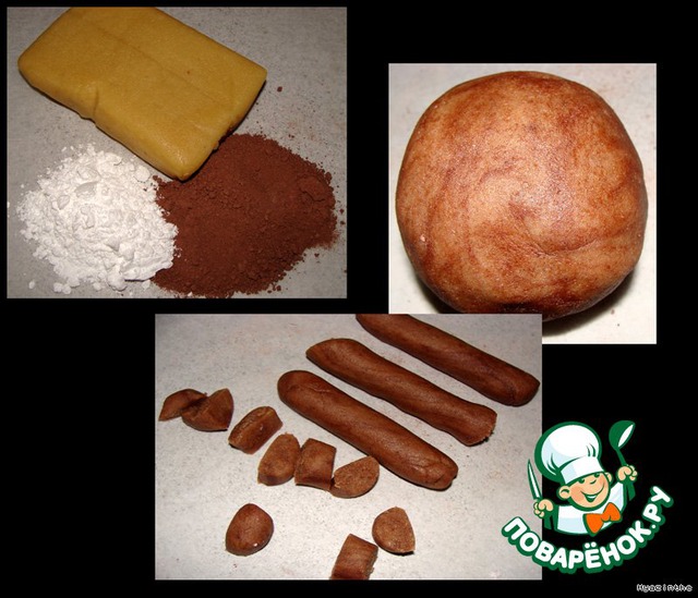 к марципановой массе добавить сахарную пудру и оставшийся какао-порошок, замесить как тесто, постепенно вмешивая пудру и какао в марципан.