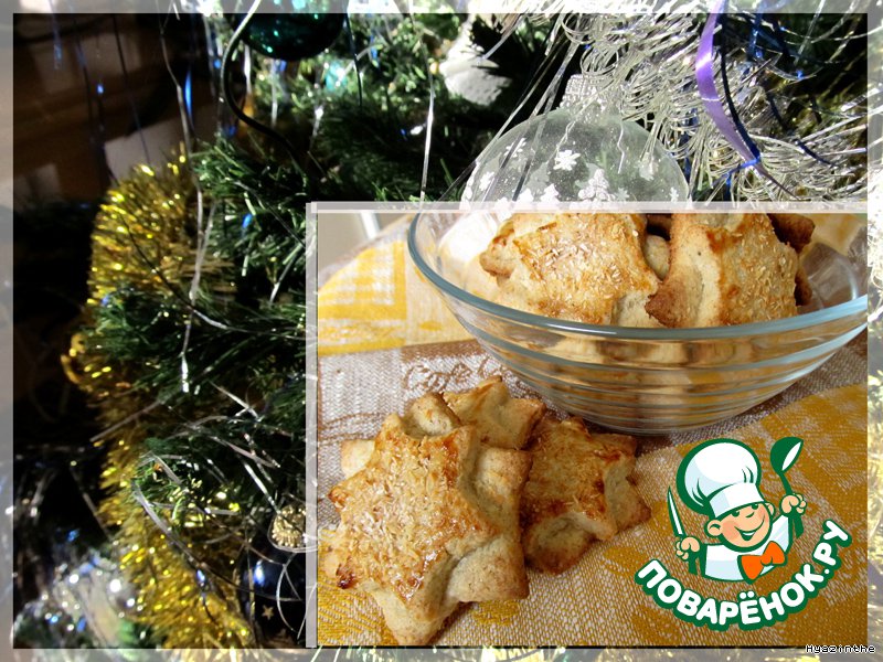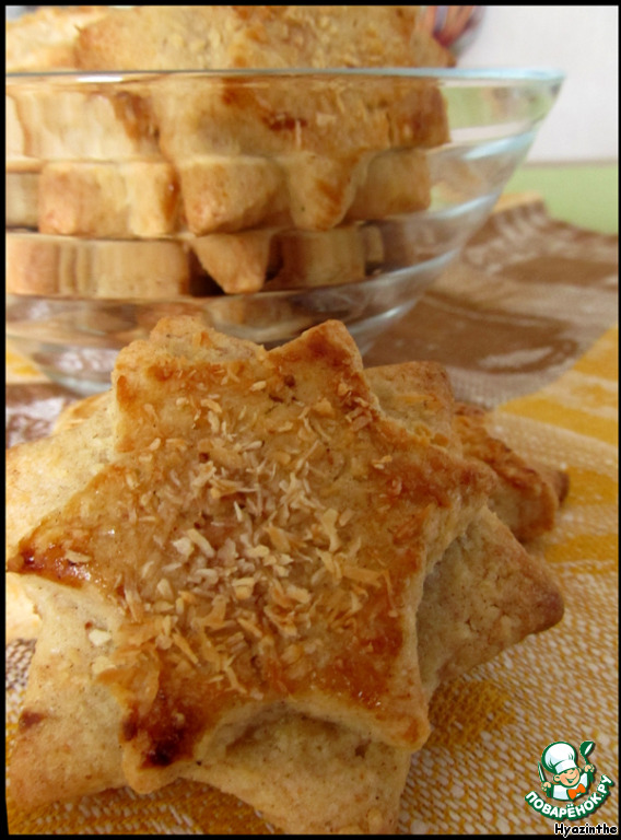 Немного меда смешиваем с имбирным порошком, смазываем звезды этой смесью и посыпаем кокосовой стружкой.