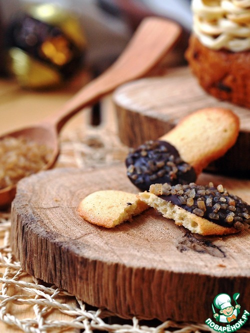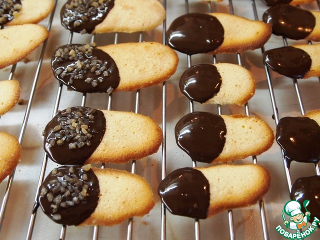 Обмакнуть кончики печенья в шоколад и разложить сушиться на решетке, вынеся ее на холод. Часть "кошачьих язычков" я, кроме шоколада, обмакивала в кристаллы коричневого сахара, чтобы добиться большей схожести с шершавыми язычками мохнатых разбойников...