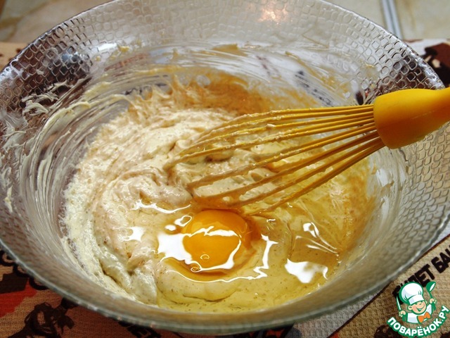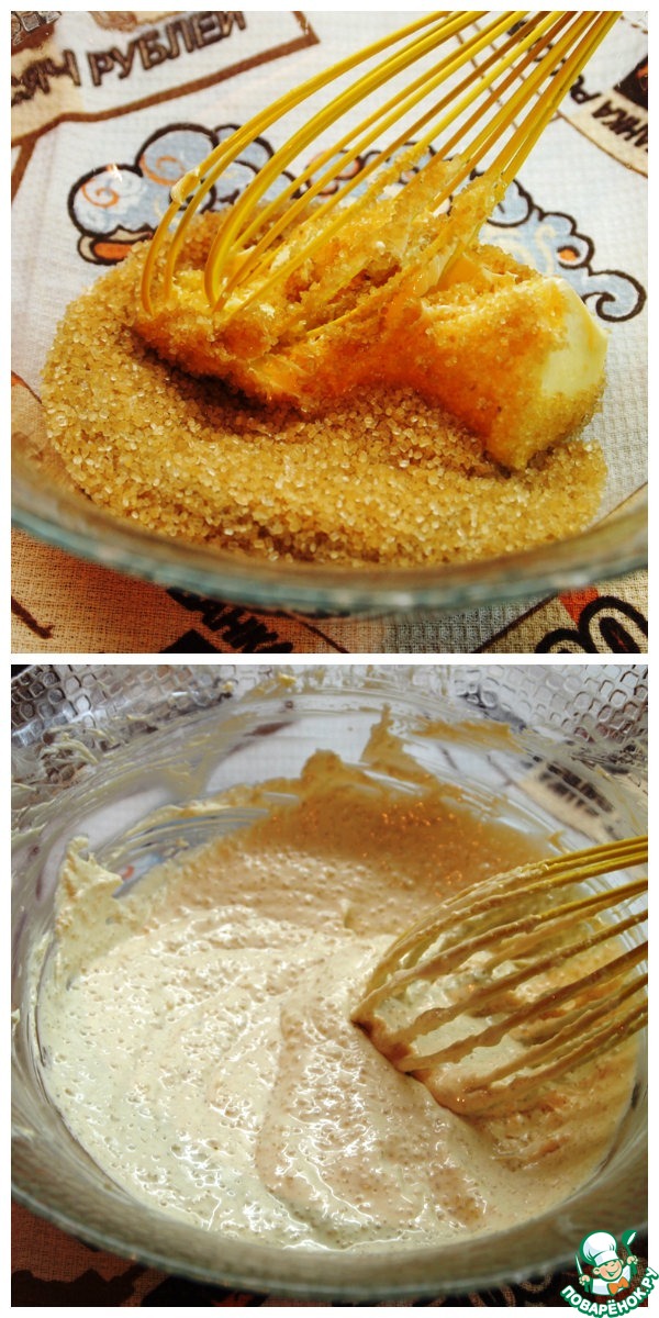Взбить в миске масло с сахаром до тех пор, пока смесь не побелеет и не увеличится в объеме. Но т. к. у меня был коричневый сахар, то я не ждала побеления, а взбивала где-то 7-10 мин. ручным венчиком, сахар растворился хорошо.