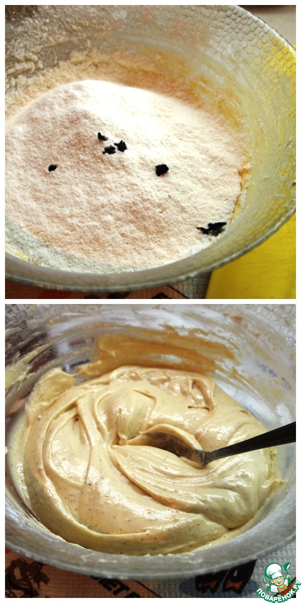 Просеять и всыпать в смесь муку, вместе с семенами ванили из стручка. (стручок разрезать вдоль на 2 части и выскрести ножом семена). Замесить ложкой тесто, оно должно получиться, как густая сметана.